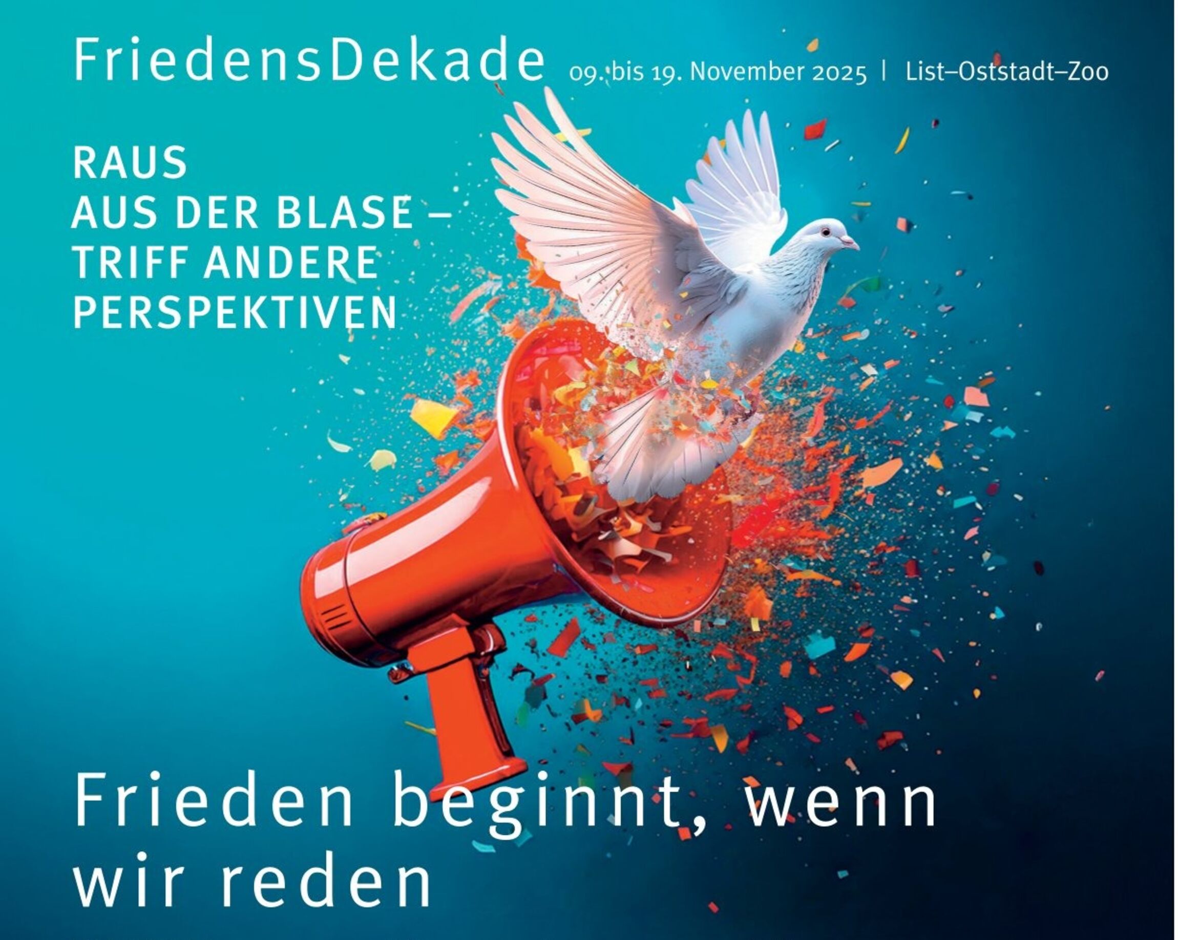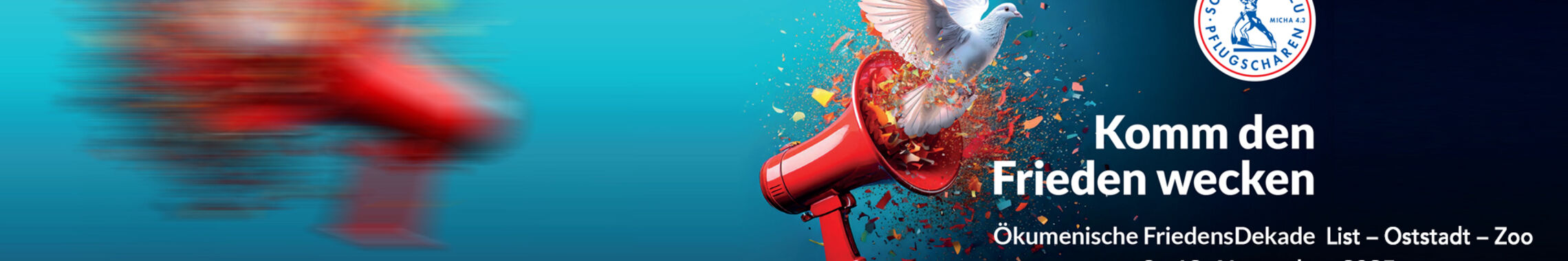 »Komm den Frieden wecken!« – unter diesem Motto steht die 45. Ökumenische FriedensDekade vom 9. bis 19. November 2025. In einer Zeit, die von Kriegen, Klimakrise geprägt ist, gestalten: durch Dialog, gewaltfreie Lösungen und gelebte Versöhnung. Angesichts der immer zahlreicher werdenden Schreckensnachrichten aus aller Welt wächst das Gefühl der Überforderung. Viele Menschen sehnen sich danach, einfach die Augen zu verschließen, um die Angst vor einer Eskalation – auch in der Gesellschaft und Politik des eigenen Landes – nicht zu nah an sich heranzulassen. In unseren Gemeinden in Oststadt/Zoo/List wird es wieder eine Anzahl von unterschiedlichen Veranstaltungen geben.