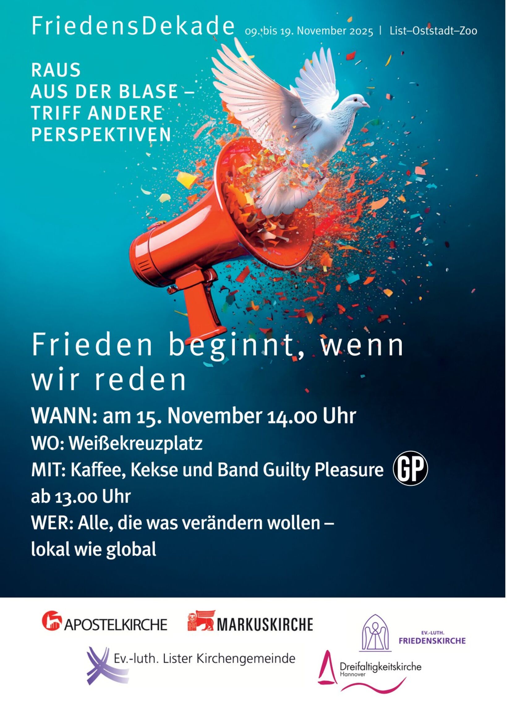 In einer Zeit, in der weltweit, aber auch innerhalb unserer Gesellschaft die Konflikte zunehmen, möchten wir Menschen, Institutionen und Vereine aus den Stadtteilen unserer Kirchengemeinden Oststadt und List zu einem offenen Austausch über ihre Gedanken für mehr Frieden und Zusammenhalt einladen: »Frieden beginnt, wenn wir reden«