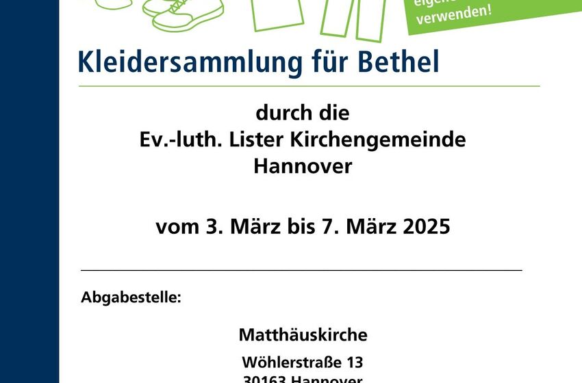 3. bis 7. März, di-fr 10-12 Uhr, zusätzlich mi 17-19 Uhr. Gesammelt werden: Guterhaltene Kleidung und Wäsche, Schuhe, Handtaschen, Plüschtiere, Federbetten. Nicht gesammelt werden: Lumpen, nasse, ...
