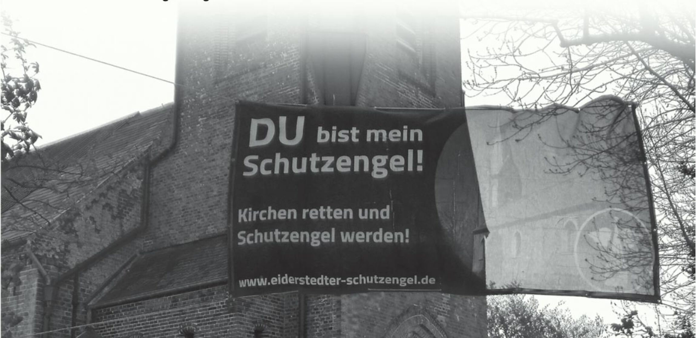 Einen Tag später fahre ich mit dem Auto am Transparent vorbei. Du bist mein Schutzengel – lese ich und wei¬ter: Kirchen retten und Schutzengel werden! Na, den Zusammenhang habe ich nicht erwartet.